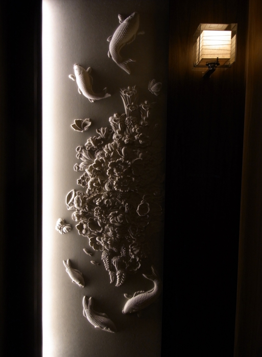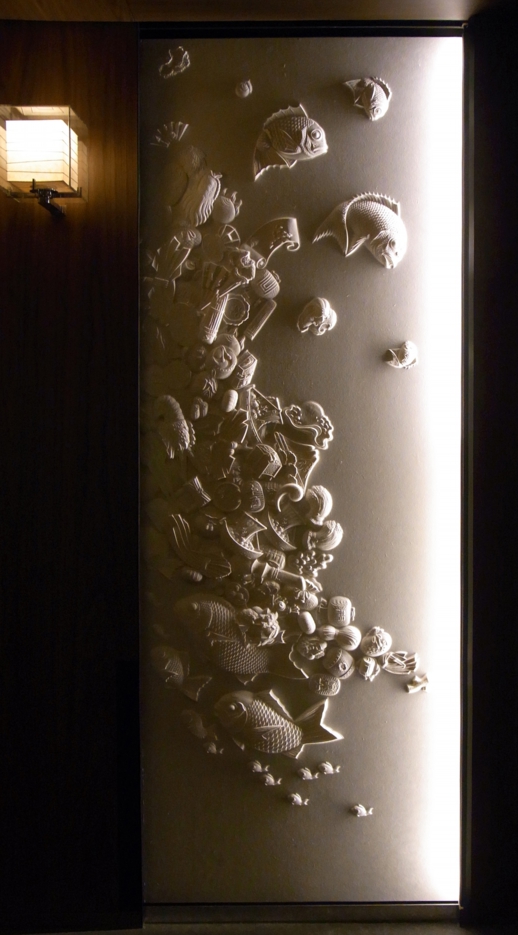 “エレベーターの暗がりの箱の中で、白い蒸気が湧き出ている。近づいて観てみると、鯛や鯉など魚の群れや四季折々の花々、鶴や亀に宝尽くしなど、今では懐かしさを覚える時代の申し子たちである。一歩下がって全体を眺めると、視野は水中、空中、水面へと変貌する。その中を彼らが右から左、左から右へと出現し、泳ぎ始めるのである。
