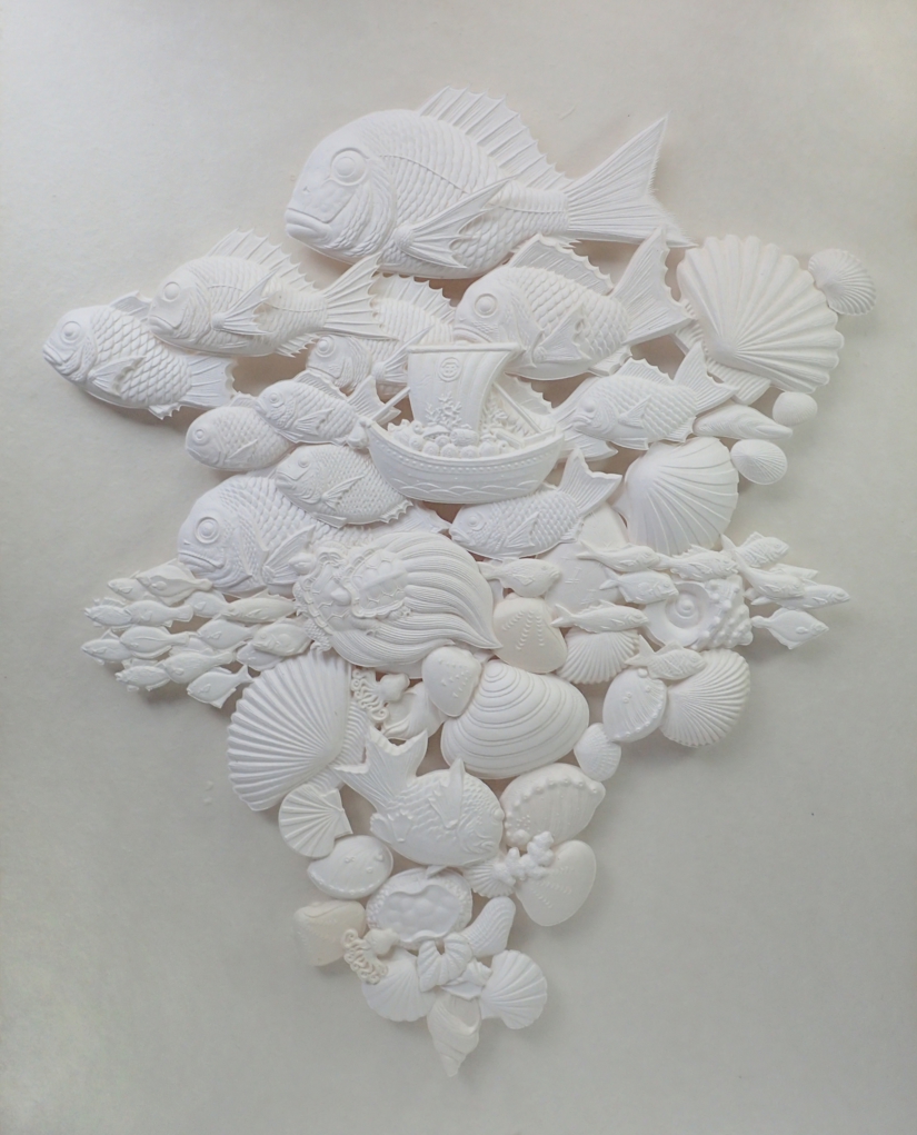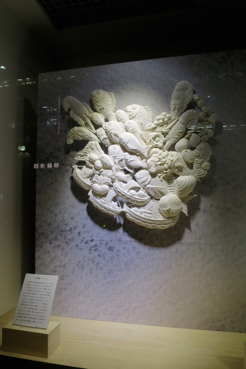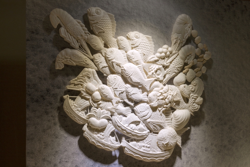 この作品には千葉の名産品である、鯛の浦の鯛と九十九里の蛤、伊勢海老、鮑などの海の幸と