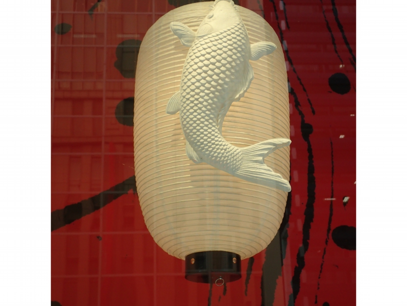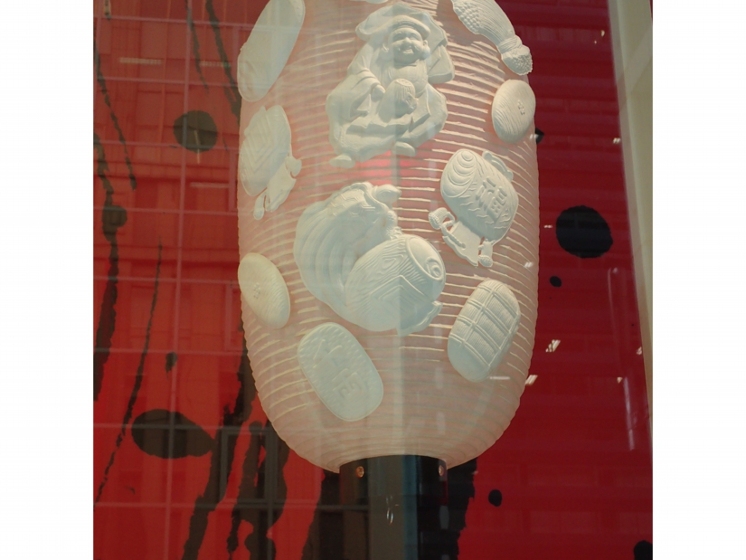 提灯祭りということで「朱の美」をテーマに、提灯に和菓紙三味を飾りました。