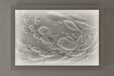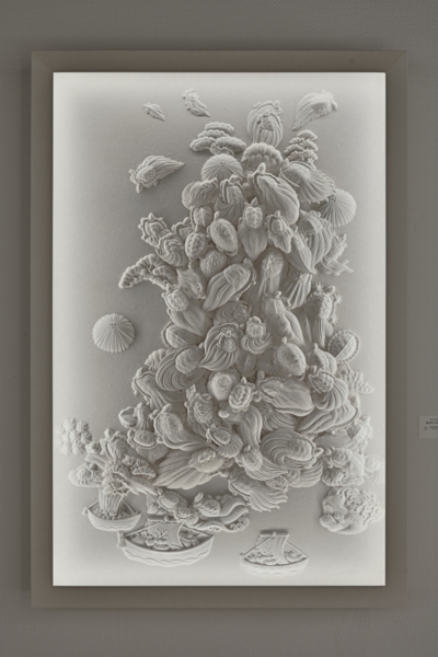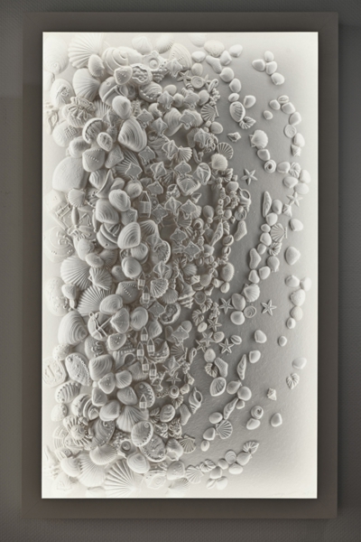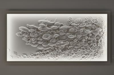 「エイの居る貝岸」制作年 2019年 寸法 894×1455mm 素材 無形文化財西ノ内紙 モチーフ 日本全国の菓子木型 木型の柄 アワビ、サザエ、蛤、舟、エイ、他 価格 ¥3,400,000 |