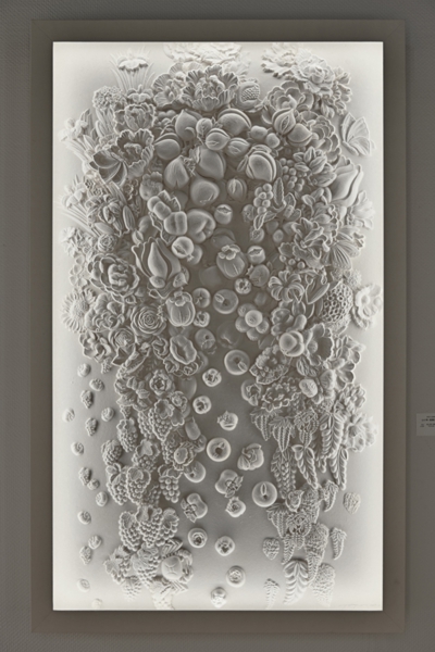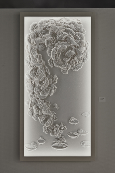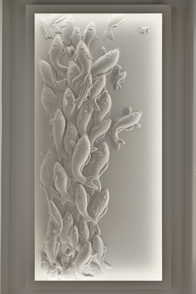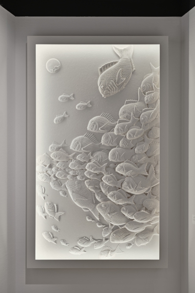 「桜波水群の輝き」制作年 2019年 寸法 1940×970mm 素材 無形文化財西ノ内紙 モチーフ 日本全国の菓子木型 木型の柄 桜、鯛、鮪、鰹、他 価格 ¥4,600,000 |